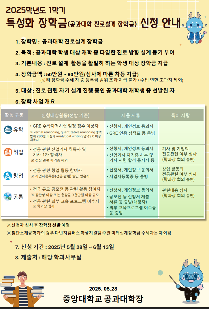 2025학년도 1학기 특성화 장학금(공과대학 진로설계 장학금) 신청 공지 [6월 13일(금) 오후 5시 까지]